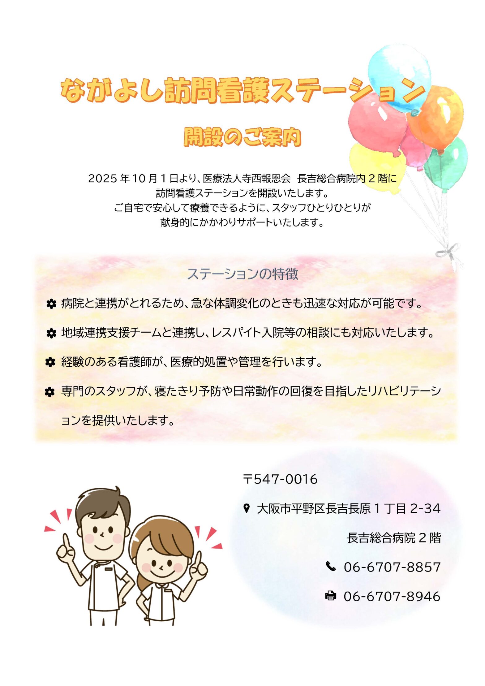 2025年10月1日より、病院内2階に訪問看護ステーションを開設いたします。 看護師が医療的処置を行うだけでなく、専門スタッフが日常動作の回復や低下予防を目指したリハビリテーションを行うので安心して自宅で療養することがで… 続きを読む ながよし訪問看護ステーションの開設のご案内