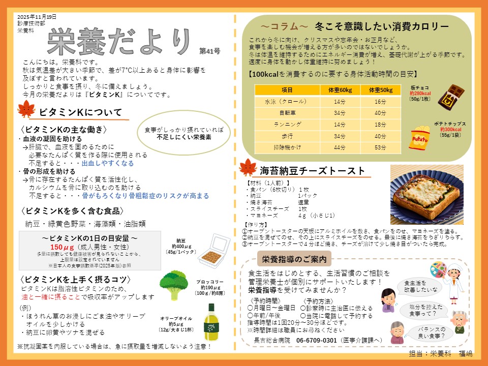 こんにちは!栄養科です。 飽きは気温差が大きい季節で、差が7℃以上あると身体に影響を及ぼすと言われています。 しっかりと食事を摂り、冬に備えましょう。 今月の栄養だよりは『ビタミンK』についてです。